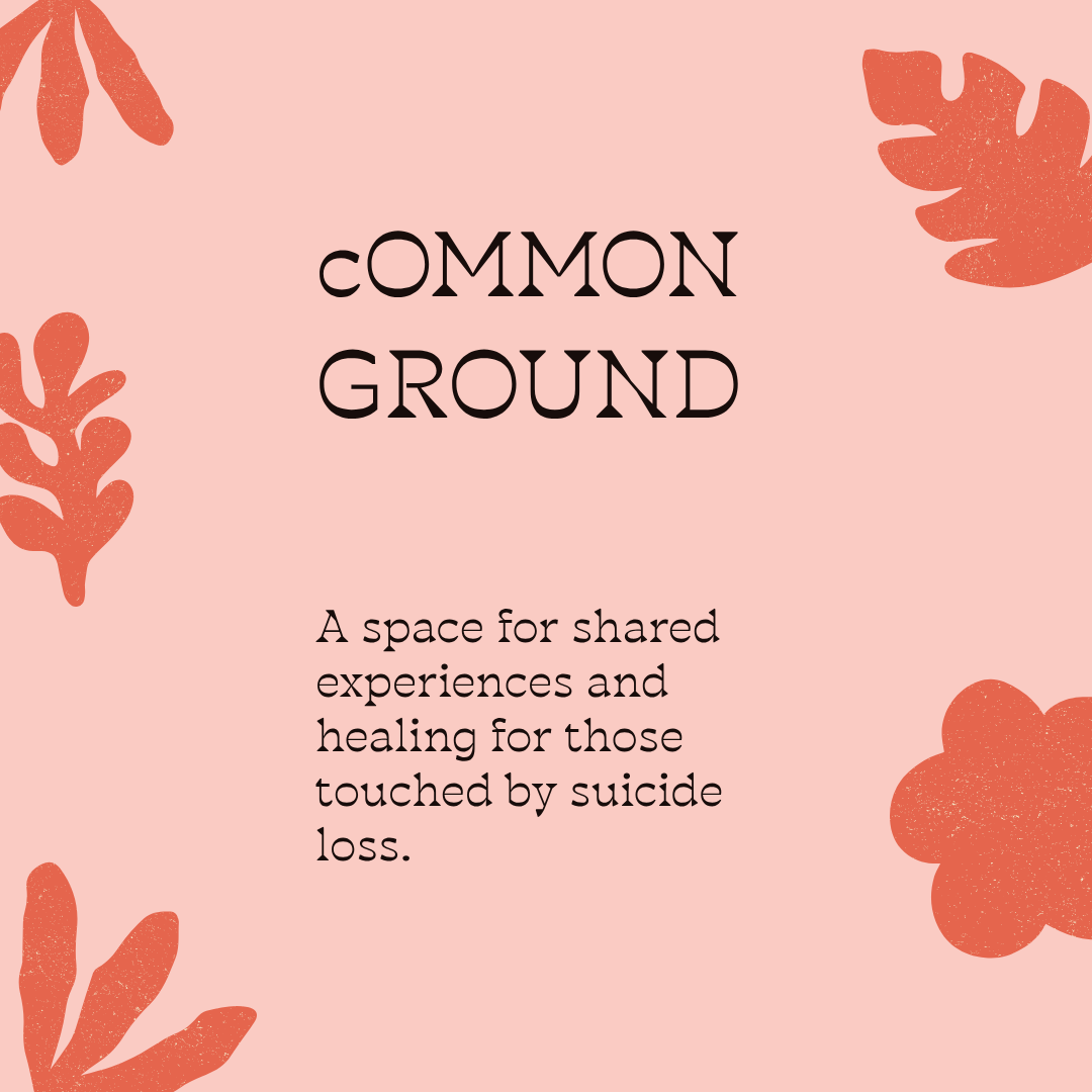 Common Ground will never takeaway the intense grief and incredible pain associated with the loss of a lovedone who has died by suicide, but connections with others, who have sharedunderstandings of such unique and complex feelings can be a powerful steptoward healing.